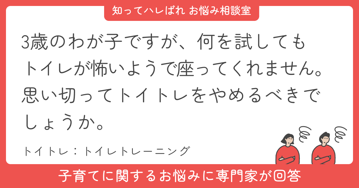 今回は、3歳のお子さんのトイレトレーニングが進まず悩んでいるママからのご相談です。入園までにおむつを外したいものの、さまざまな工夫をしてもトイレに座ることすら難しい状態とのこと。焦る気持ちから、つい強い口調になってしまい自己嫌悪に陥っているそうです。