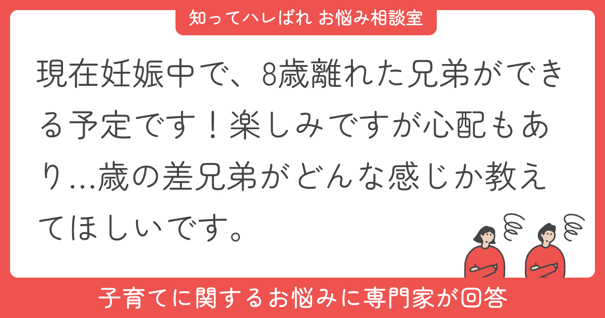 今回は、8歳の「歳の差育児」に不安を抱える30代女性からのご相談です。これから生まれてくる赤ちゃんと上の子の関わりを心配しているようです。