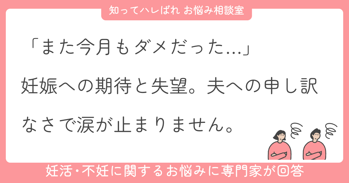 生理が来たら一気に気分が下がって毎月泣いてしまい、夫は話を最後まで聞いてくれて励ましてくれますが、申し訳ない気持ちでいっぱいです。