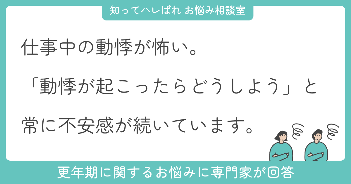 更年期に入ってから、仕事中に突然動悸がすることが増えてきました。特に立ちっぱなしだったり、体を動かすことの多い仕事なので、なかなか休む時間も取れず、不安な気持ちでいっぱいになります。対処方法も分かっておらず、数分休んで落ち着くのを待っています