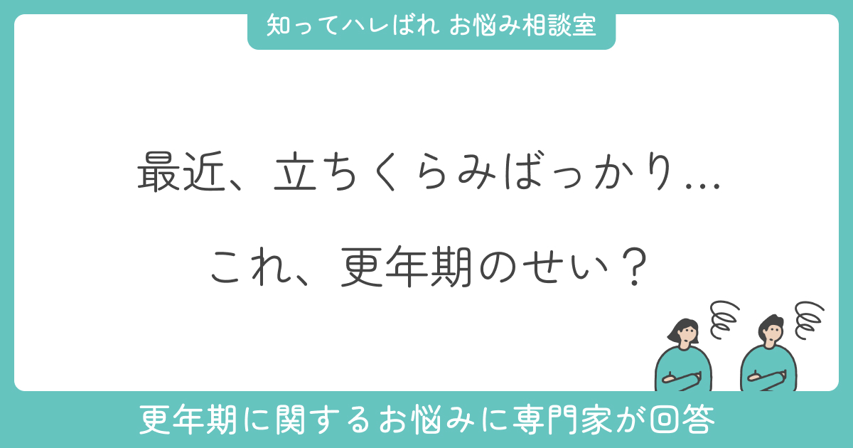 また、女性ホルモンには、血管を保護・広げる作用があるため、女性ホルモンが急激に減少することで血管や血流に問題が生じ、めまい・立ち眩みを引き起こしている可能性があります。