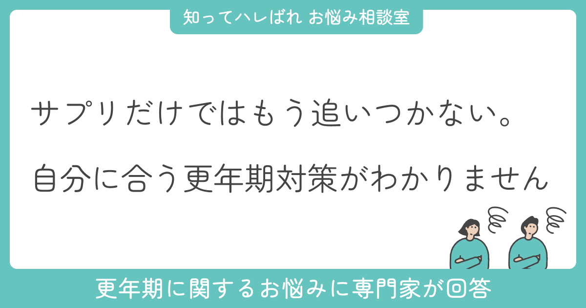 今回は、更年期の気分の浮き沈みや体のだるさが強まり、薬を使うべきか迷っている50代の女性からのご相談です。サプリだけでは追いつかず、市販薬とホルモン治療のどちらが自分に合うのか判断できず不安を抱えているとのこと。