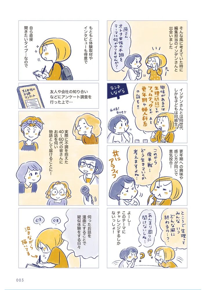 当時ちょうど私が40代で、、編集部の方とも同世代であったこともあり、これからの女性の身体のことを描けたらいいなとお話しし、「大人女性の不調」をテーマに取り上げることになりました。