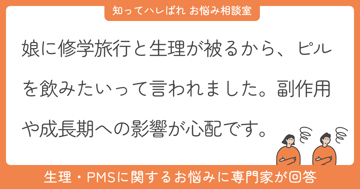 今回は、修学旅行と生理が重なりそうで「ピルで生理をずらしたい」と話す中学3年生の娘さんについてのお悩みです。