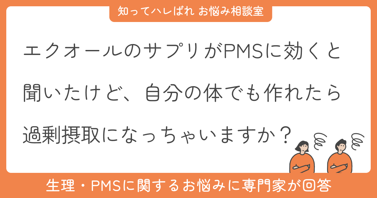 今回は、PMS対策にエクオールのサプリを試したい30代女性からのご相談です。エクオールが本当に効くのか、また、エクオールを自分の体内で作り出すことができたとしたら、過剰摂取になってしまうのではないかと気になっているようです。