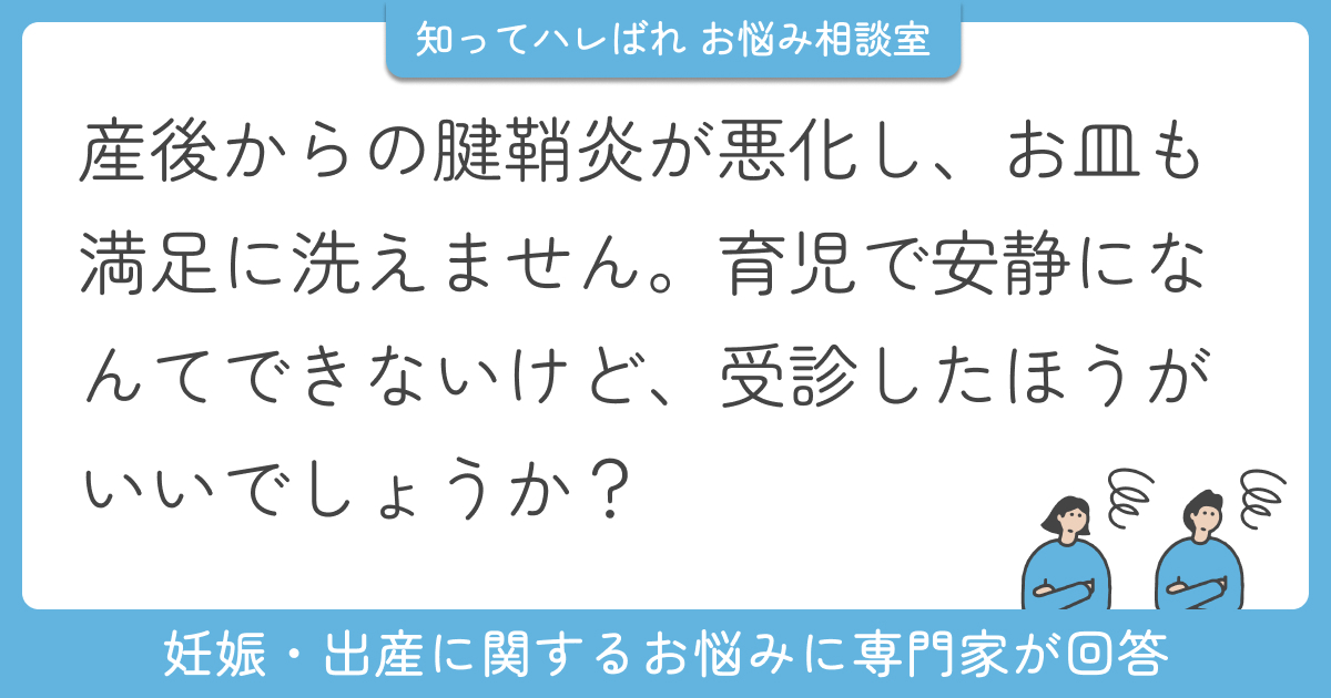 今回は、産後の腱鞘炎で手首に激痛があるものの、ワンオペ育児のため受診に迷っている20代女性からのご相談です。整形外科や鍼治療など、どこで治療を受けるのがよいかも悩まれているようです。
